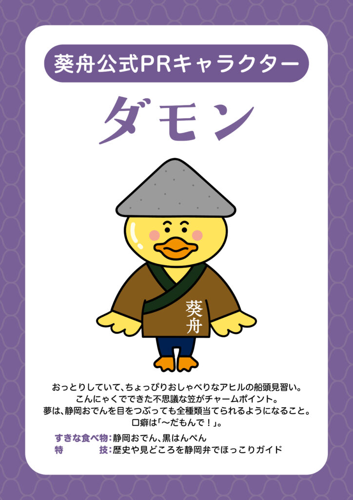 こんにゃくでできた笠がチャームポイントの、ちょっぴりおしゃべりなアヒルの船頭見習いです🐤